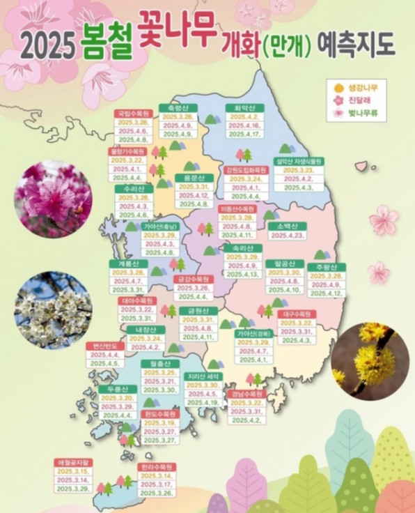 봄이 다가오면서 많은 분들이 2025년 봄꽃 개화 시기를 궁금해하고 계실 텐데요. 최근 산림청이 발표한 예측에 따르면, 올해 개화 시기는 지난해보다 다소 늦어질 것으로 보입니다. 다가오는 봄, 언제 어디에서 아름다운 꽃을 만날 수 있을지 함께 알아볼까요?