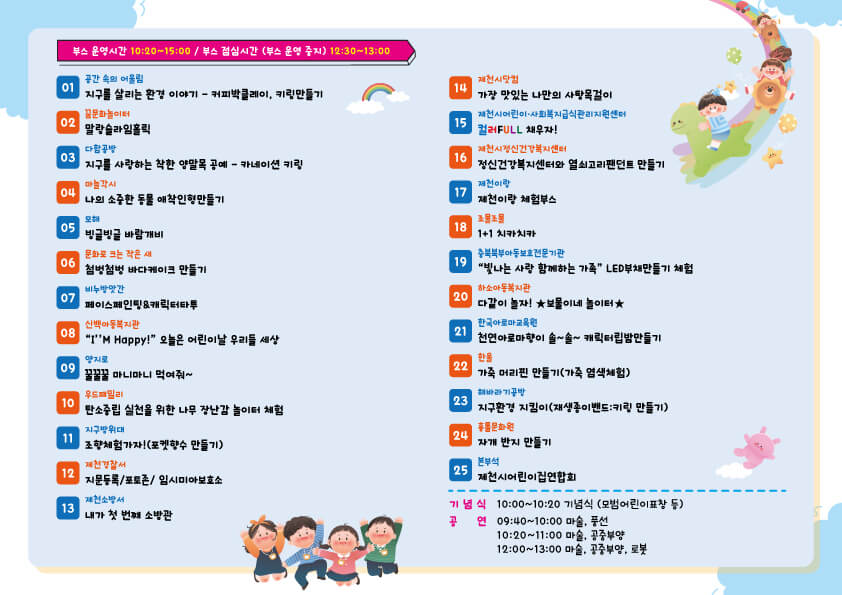 마술쇼, 랜덤플레이댄스, 어린이 합창단, 가족장기자랑*이외에도 다양한 부스에서 알차게 준비한 이벤트를 즐겨보세요.